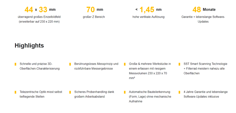 Les interféromètres à lumière blanche Polytec mesurent et évaluent des paramètres de forme tels que l’épaisseur, le parallélisme, la hauteur de pas et l’ondulation en 3D avec une résolution nm. TopMap Pro.Surf visualise tous les détails de surface sur de grandes surfaces, ce qui le rend rapide et efficace pour les grands échantillons, voire les mesures multi-échantillons. La capture de 2 millions de points de mesure sur un grand champ de mesure unique de 44 x 33 mm en quelques secondes seulement accélère l’inspection de vos surfaces. Pour un champ de mesure plus large, étendez-le par assemblage à un champ de vision combiné de 230 x 220 mm. La plage de mesure verticale exceptionnellement large de 70 mm (axe Z) et l’excellente résolution verticale indépendante de la taille du champ d’image offrent une grande liberté et un espace de travail généreux, s’adaptant à vos besoins de mesure individuels. L’optique télécentrique avec une plage Z de 70 mm atteint les zones difficiles d’accès et profondes, telles que les perçages et les surfaces encastrées.